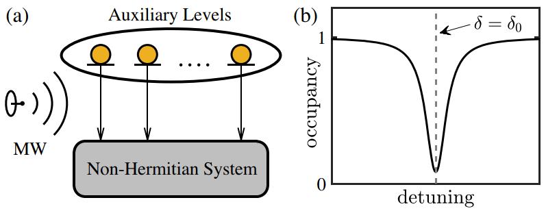 (a)实验系统示意图,其中非厄米系统与辅助能级通过弱微波耦合。原子首先制备在辅助能级上,经过一段时间后测量辅助能级剩余的粒子数。(b)辅助能级占据数随微波失谐变化的典型示例。