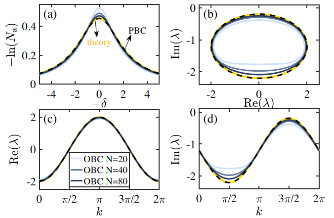 该研究采用主方程与线性响应理论,推导出周期边界条件下动量为k的辅助能级占据数与微波失谐和动量空间本征能量的关系,基于该公式,可以对辅助能级占据数随微波失谐的变化曲线进行拟合得到系统动量空间能谱;同时,该研究证明当系统存在边界时,测量结果随着系统尺寸增大逐渐趋于周期边界下的结果,这意味着对于一个无穷大的系统,测量结果与边界和非厄米趋肤效应无关。该研究进一步基于Hatano-Nelson模型数值验证了这一现象。
