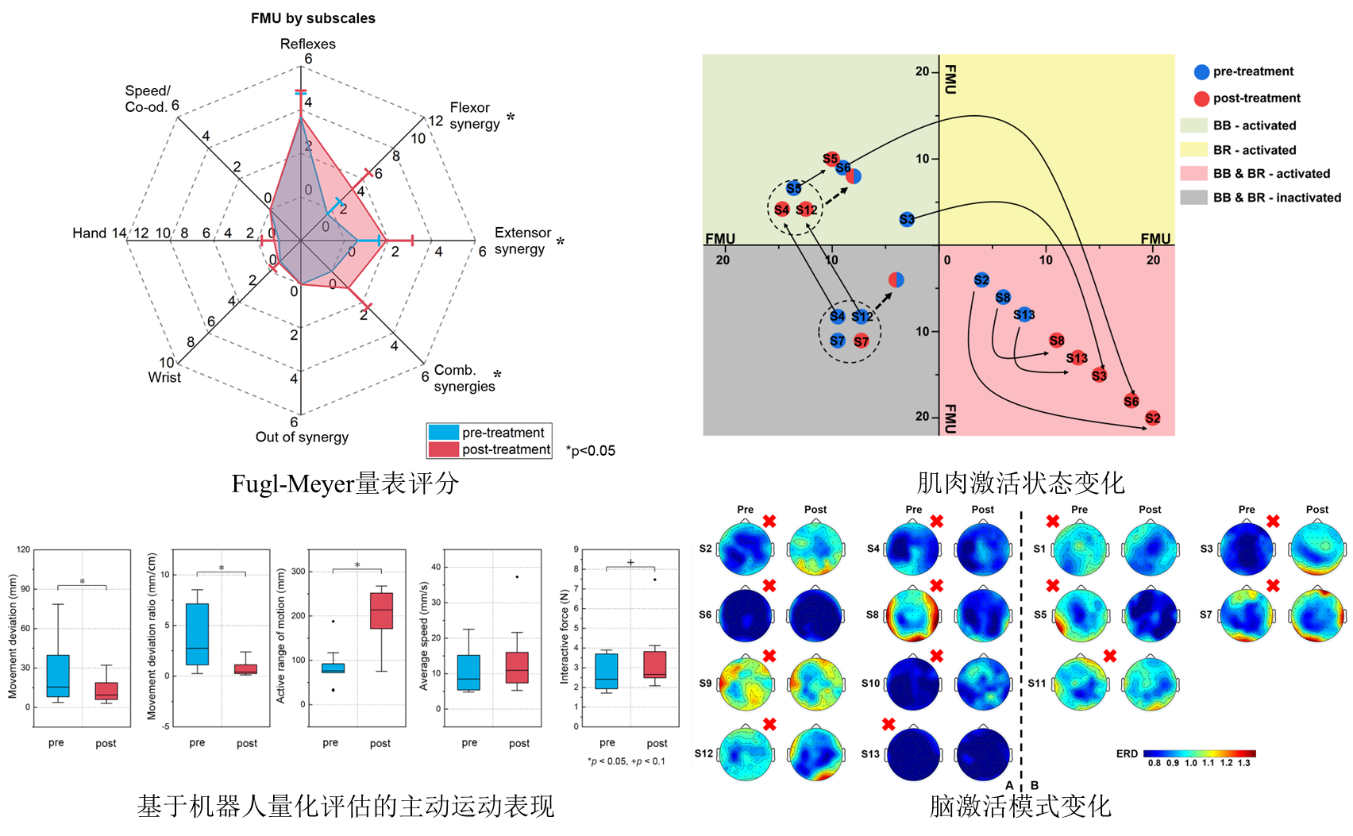 临床实验结果显示,经过两周训练患者患肢丧失的自主运动功能均得到恢复,可自主实现上肢屈曲伸展动作,训练后Fugl-Meyer评分显著提升,基于机器人辅助量化评估结果显示患者运动功能能力得到改善,患肢肌肉激活状态明显改善,且运动精度大幅提升。本研究围绕机器人辅助神经康复训练中患者个体差异性适配问题,通过运动控制脑区、运动意图信息精准识别及解码,提出了康复机器人与脑机接口有机结合的个体化神经康复技术,解决了康复机器人临床实用及推广的瓶颈问题。