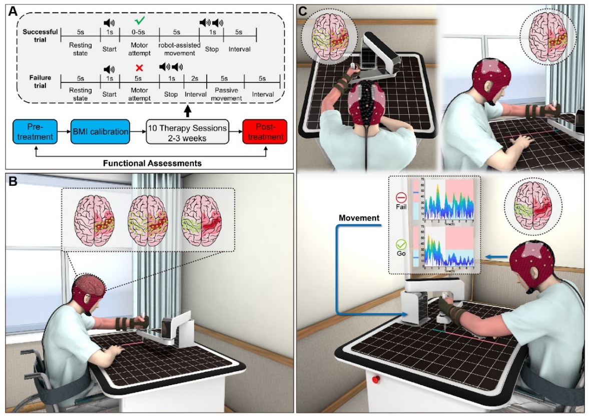 本研究募集了一批发病六个月内伴有运动功能障碍的卒中患者,每位患者均接受为期两周的个体化脑机交互训练。每位患者训练前进行大脑运动意图表达脑区识别,并将每位患者的运动意图特征和神经重组模式纳入到脑机交互训练设计中,依据其个体差异性表达构建神经重组脑区与患肢动作行为间的运动感觉闭环,从根本上理解患者受损特征、促进个体化神经环路高效重建。