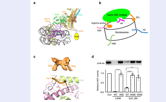 (a)HAT模块结合核小体的结构模型;(b)NuA4通过空间位置识别H4的模式图;(c)Arginine anchor局部电镜密度图及其与酸性区相互作用结构细节;(d)多肽竞争性实验显示Arginine anchor对NuA4乙酰化活性的重要性