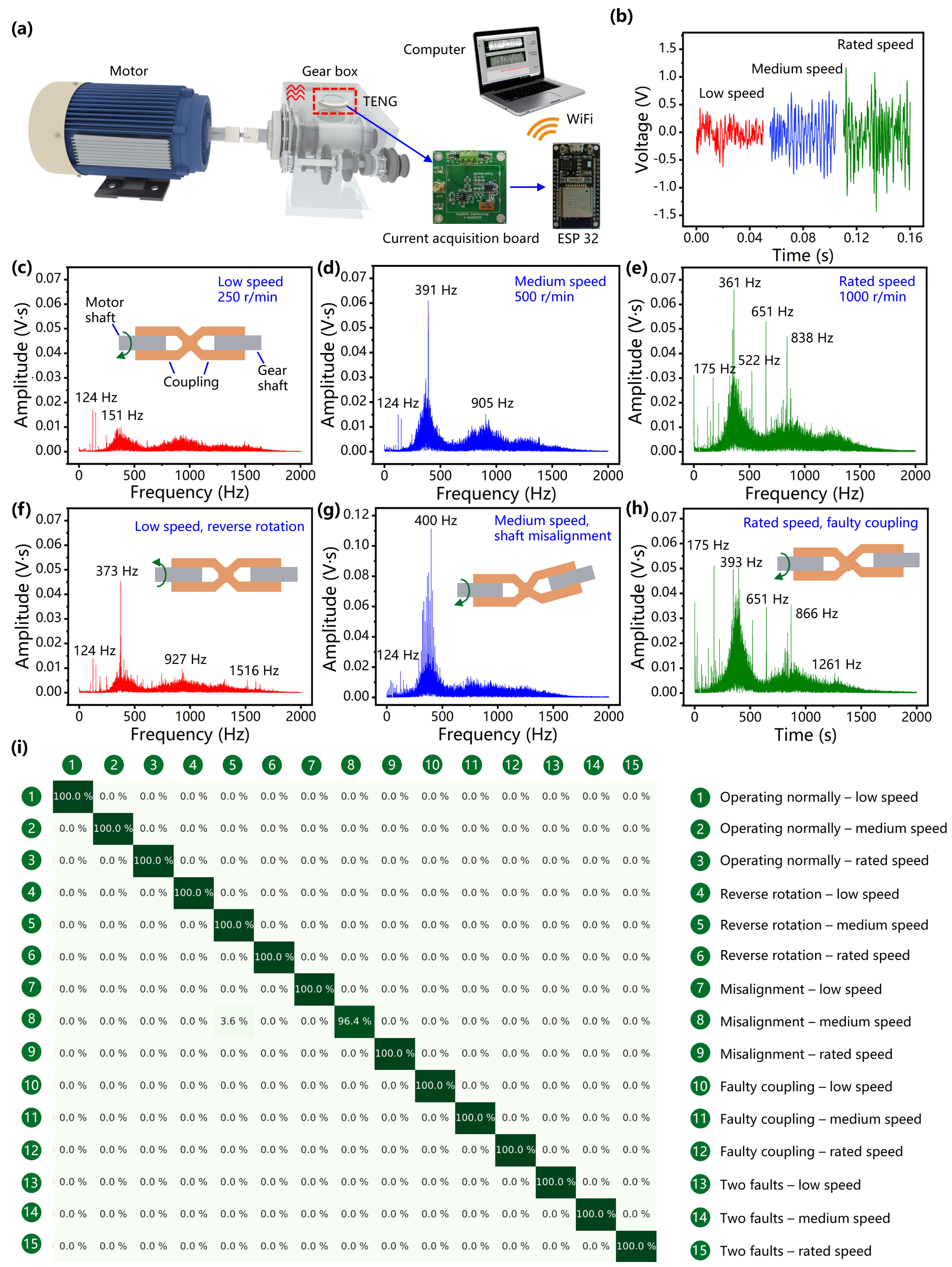 近日,星空体育深圳国际研究生院丁文伯助理教授的智能感知与机器人(Smart Sensing and Robotics, SSR)课题组开发了一种基于摩擦纳米发电机(TENG)的高灵敏度自驱动振动传感器。利用柔性介电薄膜与多孔金属材料构建摩擦层,有效提升了TENG传感精度,所制备的TENG传感器可以检测到1-2000 Hz频率的振动,即使在高温高湿的环境中,TENG传感器输出的信号在波形上不失真(幅值改变)。在实验室条件下将TENG传感器初步应用于机械齿轮系统的运行状态检测,将机器学习与TENG信号识别相结合,达到了高准度识别机械系统运行状态的目的,检测结果可实时显示在远程监控或者移动设备上。TENG传感器同时可用于空气压缩机、热风枪、砖瓦空鼓等方面的振动检测,并通过嵌入式系统将运行状态在屏幕显示。该工作为构建TENG自驱动传感器提供了新思路,在机械故障智能诊断方向具有应用潜力。
