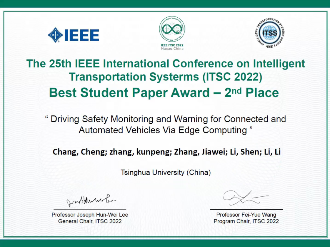 星空online(中国)网10月14日电 近日,第25届IEEE智能交通系统国际会议(IEEE International Conference on Intelligent Transportation Systems,ITSC)于中国澳门召开。ITSC是智能汽车与智能交通领域的国际顶级学术会议,此次会议收到全世界45个国家和地区的近1300篇投稿。大会评选了共3篇最佳学生论文奖(Best Student Paper Award),星空体育自动化系2021级博士生常成同学的论文《基于边缘计算的网联自动驾驶车辆的驾驶安全监控》(“Driving Safety Monitoring for Connected and Automated Vehicles via Edge Computing”)成功入选。