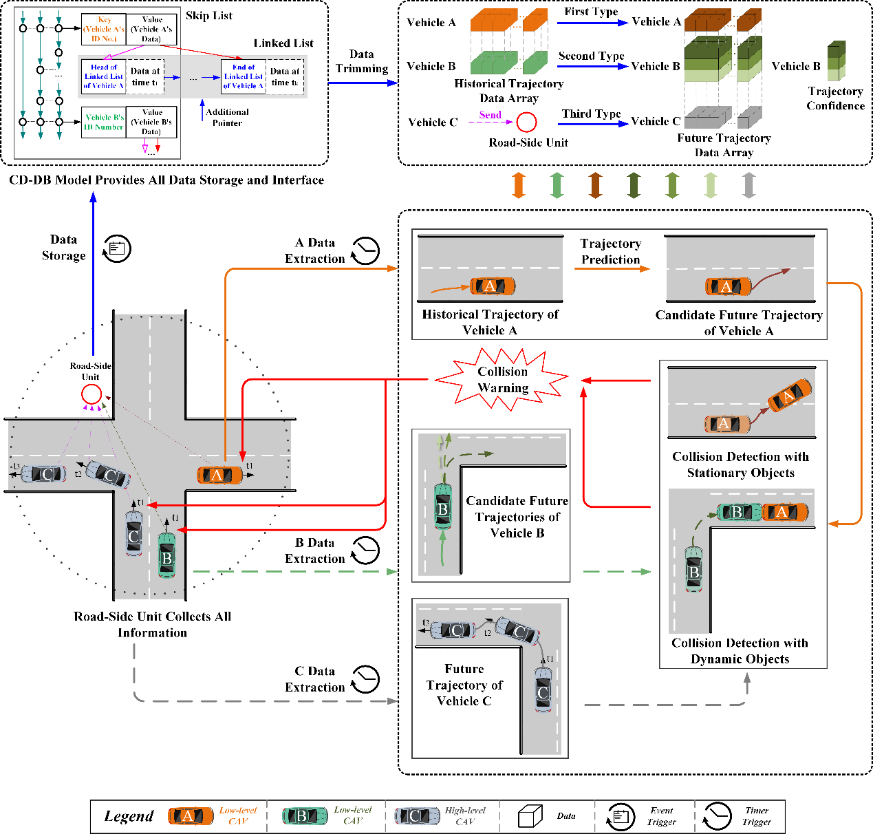 V2X通信技术的发展为我们解决驾驶安全监控及风险预警问题提供了新的基于协同驾驶和车路协同的思路。借助V2X通信技术,我们可以收集所监控道路的智能网联车辆数据,实施路侧单元边缘计算预警,其优势包括:系统仅需要收集车辆的位置和运动数据;系统的数据库可直接检索到驾驶环境数据,从而显著降低感知数据的计算成本,有效避免车辆遮挡、感知误差及识别失效等问题,以全面准确地获取场景中所有车辆的信息;系统可以积累海量的车辆历史轨迹数据用于运动预测和碰撞预警。