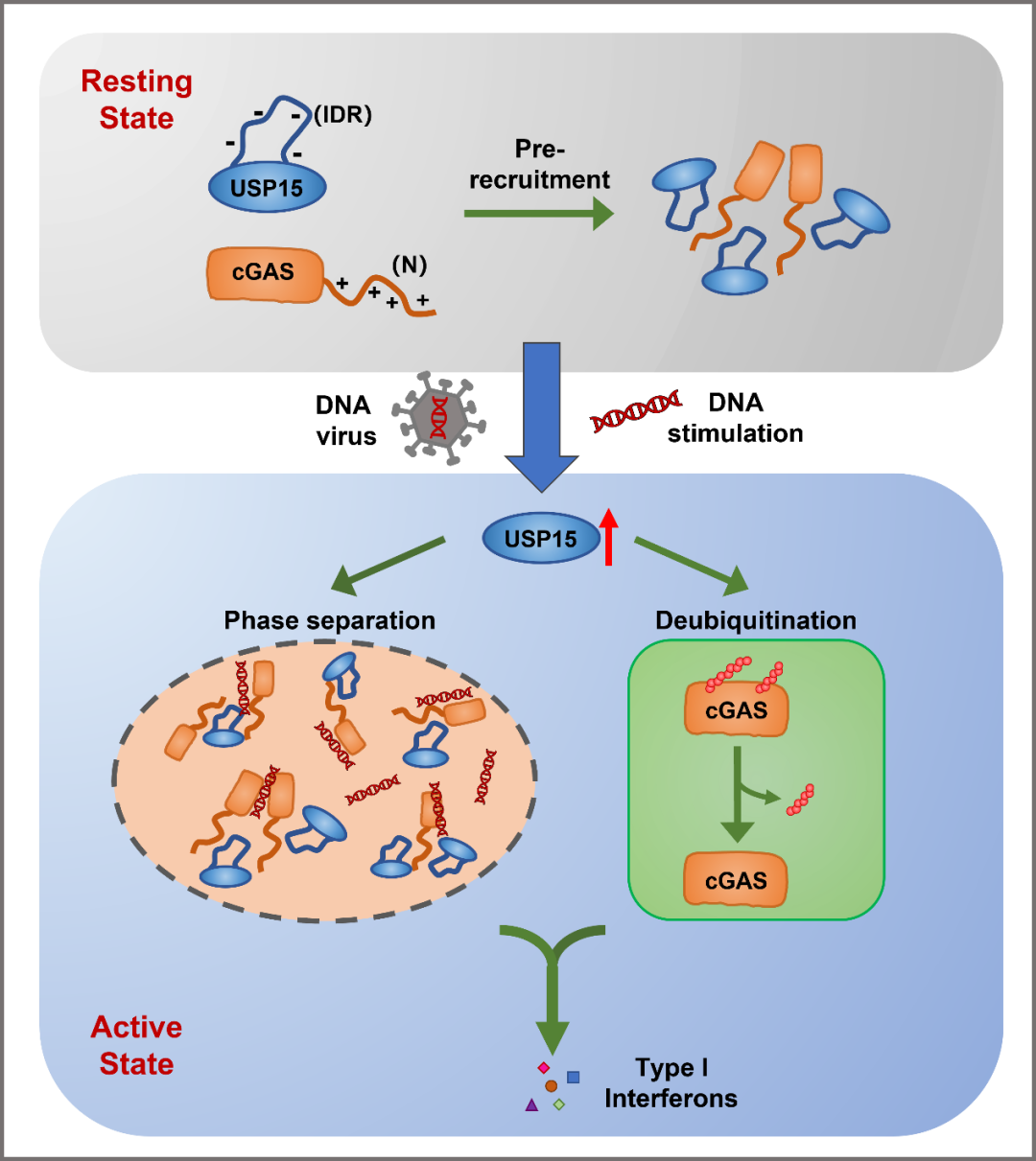 USP15介导的cGAS去泛素化修饰和增强相分离的过程促进了DNA引起的天然免疫信号,揭示了天然免疫通路中的全新的微调控机制