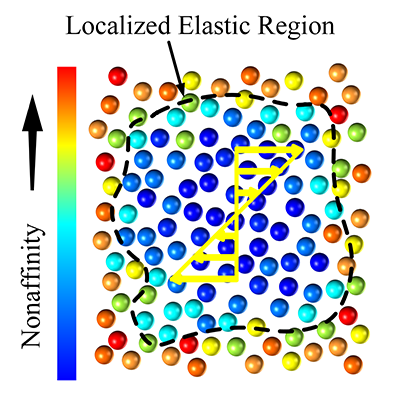 星空体育工程物理系王哲副教授课题组选取在实验室和工业生产中均非常常见的胶体体系作为研究过冷液体流动性质的模型系统。通过理论分析和布朗动力学模拟,建立了“局域弹性区(localized elastic region)”理论模型。图2给出了该模型的示意图。局域弹性区是流体中的瞬态微观单元。它的弹性形变和屈服是过冷液体的黏弹性的微观物理基础。基于该模型,剪切变稀现象和液体的微观结构变形以及弹性性质之间得以建立定量的标度律关系。在理论和模拟研究的基础上,课题组利用小角中子散射技术对该模型进行了实验验证,实验结果支持了理论模型的合理性。