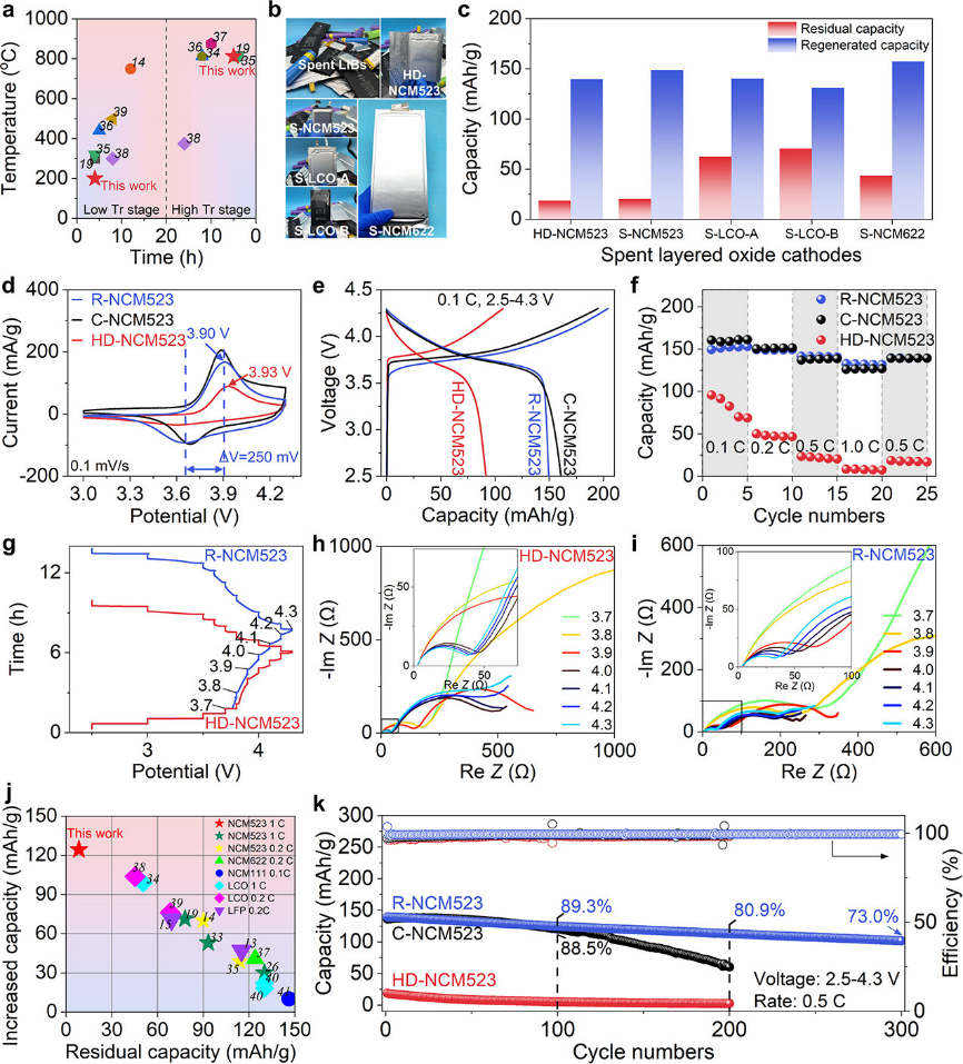 团队提出具有最低共熔点的二元锂盐共熔体系,实现高失效程度三元电极材料的直接修复。完全失效的镍钴锰三元材料NCM523(镍钴锰比例5:2:3)经过修复后,容量可提升至与商业材料水平相当,200圈循环后容量保持率仍然有80%以上,可以直接作为电极材料使用。该方法适用性广泛,对NCM111(镍钴锰比例1:1:1)、NCM622(镍钴锰比例6:2:2)、钴酸锂等层状过渡金属氧化物正极材料均适用,具有较大的实际应用前景。