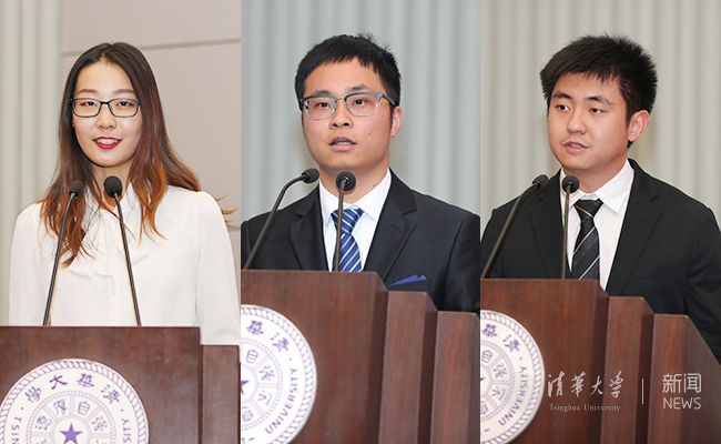 校级优秀班集体代表、生64班的赤雅蓉,特等奖学金获得者、材料学院2015级本科生江国琛,特等奖学金获得者、电子系2014级研究生高昕宇发表获奖感言