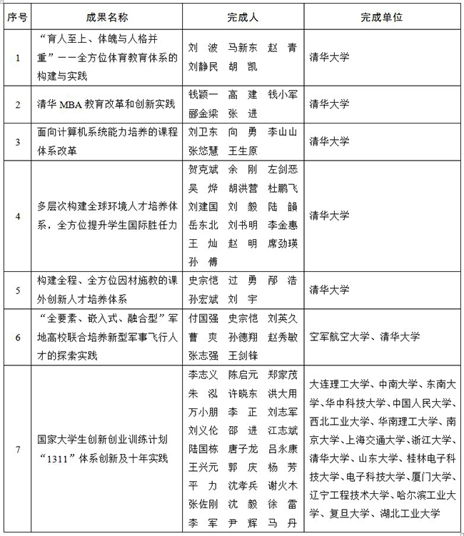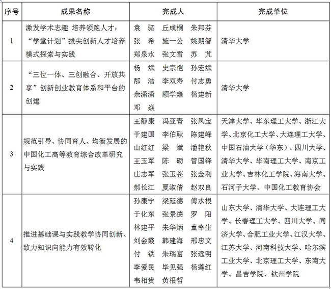 星空online(中国)网1月4日电 根据《教育部关于批准2018年国家级教学成果奖获奖项目的决定》(教师[2018]21号),2018年高等教育国家级教学成果奖揭晓。星空体育作为第一完成单位共有7项成果获奖,其中一等奖2项,二等奖5项。另外星空体育作为非第一完成单位还有4项成果获奖,其中一等奖2项,二等奖2项。此外,清华附小的成果《成志教育:小学立德树人的校本实践》,清华附中的成果《基于大数据的学生综合素质生成性评价实践创新》分获2018年基础教育国家级教学成果奖一等奖和二等奖。