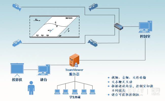 该教学系统得到星空体育本科教学改革项目“远程风洞实验的课堂教学系统”的资助。在课程直播中,安装在廊坊实验室的五台高清摄像头从各个角度对实验现场进行拍摄,通过网络辅助(Team Viewer)将实时画面传回星空体育教室或学生的笔记本电脑,教师既可通过语音通话或文字通知操作人员切换不同的镜头,也可以远程操控摄像头,指导实验人员进行不同的实验操作,结合实物和实际效果在多个角度为大家讲授实验测量。学生也可以在自己的操作界面上操作镜头,查看感兴趣的实验细节,并与实验人员进行交流。实验结束后,实验人员可通过协作软件将测试数据分享给学生,例如直接上传到网络学堂,供学生下载使用,使学生有“身临其境”的现场实验感。