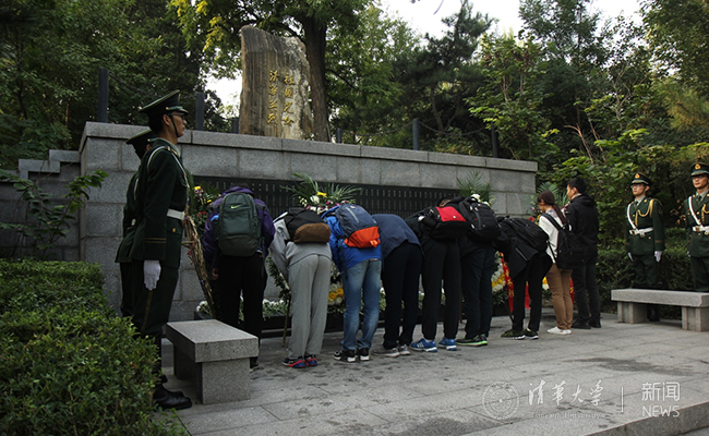 清华师生向“祖国儿女 清华英烈”纪念碑致敬。范若琛 摄