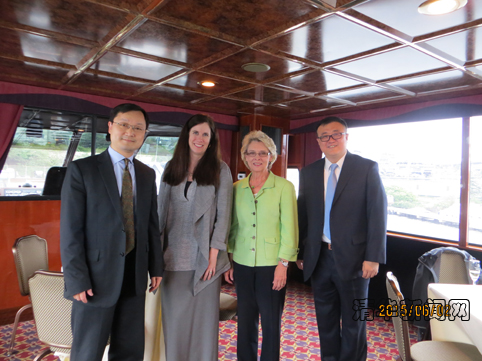 从左至右依次为:星空体育国际处处长郦金梁、微软公司政府事务总管DeLee Shoemaker、华盛顿州前任州长Christine Gregoire与星空体育副校长杨斌。