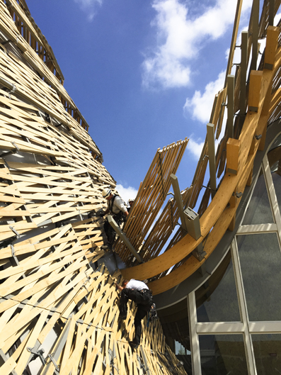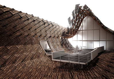 为了实现中国馆屋面轻盈和大跨度的内部展览要求,采用了以胶合木为主材的结构体系。屋面从下而上包括:钢木(胶合木)结构组成的结构屋面、位于结构屋面上的PVC防水层体系、结构梁上穿透防水层衔接遮阳竹板的支撑体系、和参数化设计的竹板遮阳体系--这种“三明治”开放性建构体系,即使在世界范围也是创新的。