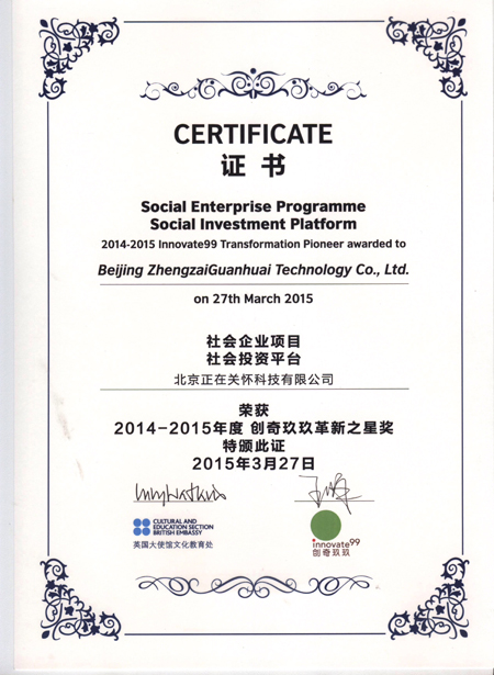在英国大使馆文化教育处举办的社会企业创业项目颁奖典礼上,恩启项目荣获社会企业项目革新之星大奖。该奖项被誉为社会企业界的“奥斯卡”。本届有434个项目参与,18个项目最终入围获此殊荣。此次获奖,说明恩启项目启动一年多来的研究成果和社会价值已越来越受到社会各界人士的支持和认可。交互媒体研究所副所长王伟代表恩启项目团队领取了该大奖。