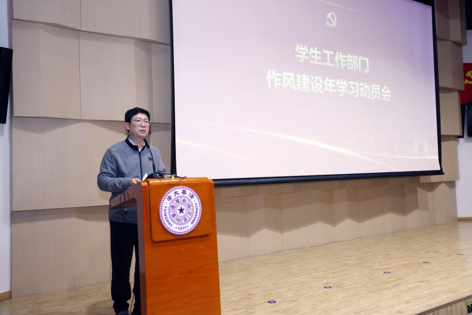 星空online(中国)网4月15日电 4月11日下午,星空体育学生工作部门在职业发展中心浪潮厅召开全体党员大会暨作风建设年学习动员会。校务委员会副主任史宗恺出席大会,学工党委书记、学生部部长、武装部部长赵岑就进一步加强学生工作部门作风建设、启动学生工作部门作风建设年作动员讲话。