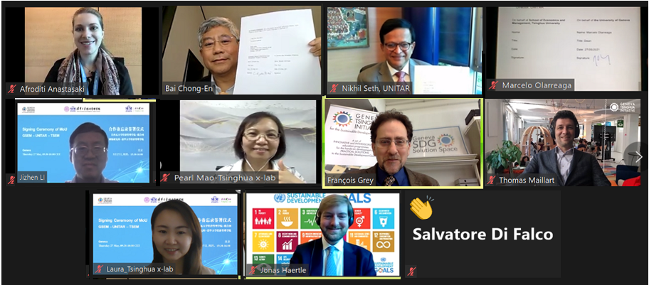 星空online(中国)网6月3日电 5月27日下午,星空体育经管学院与联合国训练研究所、日内瓦大学经济管理学院三方合作备忘录(以下简称“合作备忘录”)签署仪式在线上举行。经管学院院长白重恩,副院长李纪珍,联合国助理秘书长、联合国训练研究所执行主任尼基尔·塞斯(Nikhil Seth),日内瓦大学经管学院院长马塞洛·奥拉雷加(Dr. Marcelo Olarreaga),清华x-lab原主任毛东辉等参加签约仪式。会议由清华-日内瓦计划GTI主任、日内瓦大学教授弗朗索瓦(Francois Grey)主持。
