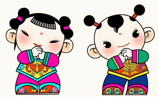 吴冠英教授表示,在设计上以一对身着民间传统服饰的男、女娃娃,双手做拜年的姿态,表达春节的特定内涵。同时围绕这一重要传统节日丰富多彩的节庆活动,做了部分延展的设计。