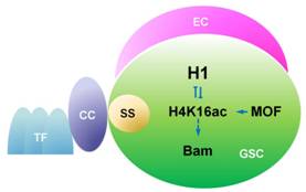 卡通图显示果蝇的卵巢管顶端结构一部分。H1和MOF协同控制H4K16乙酰化水平,进而通过下游分化因子bam维持正常干细胞数目。TF, terminal filament cell; CC, cap cell; EC, escort cell; SS, spectrosome; GSC, germline stem cells.