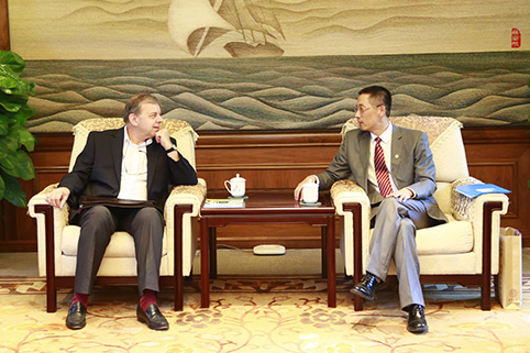 施一公与《自然》主编菲利普·坎贝尔会谈。记者 苑洁 摄