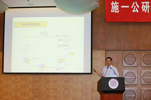 施一公介绍研究组关于RNA剪接研究取得的重大成果。记者 苑 洁 摄