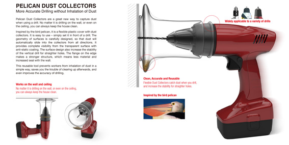 此次蒋红斌、钟夏指导,龚华超、曾邵庭、杨冬蕴、张铭伟组成的研究生创作团队的获奖作品“防尘鹈鹕杯”,是针对电钻在墙面上钻孔时,如何防止灰尘散落,保持环境清洁而研制的。它是一个带有兜状形态的弹性塑料罩。它使用方便,将它套在手钻前面,使用时特殊的翻边可以自然地贴合墙面。简洁的曲面几何形态经过反复推敲,各个方向的粉尘会自动滑入鹈鹕喙状的容器中。全透明的材质表面配备防静电涂层,不沾灰,可以方便地透过它观察钻孔的情况。曲面纵向曲率顺着与墙面垂直的方向,可以增加手钻打孔时的垂直稳定性,打出更直的孔。甚至在天花板上钻孔时,依然可以流畅地完成无尘钻孔。