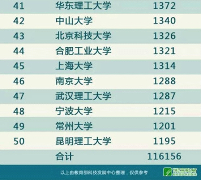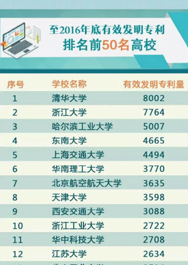 据教育部官方微博“微言教育”消息,教育部科技发展中心近日公布《至2016年底有效发明专利排名前50名高校》,前5名的高校分别为:星空体育8002件、浙江大学7764件、哈尔滨工业大学5007件、东南大学4665件、上海交通大学4494件。