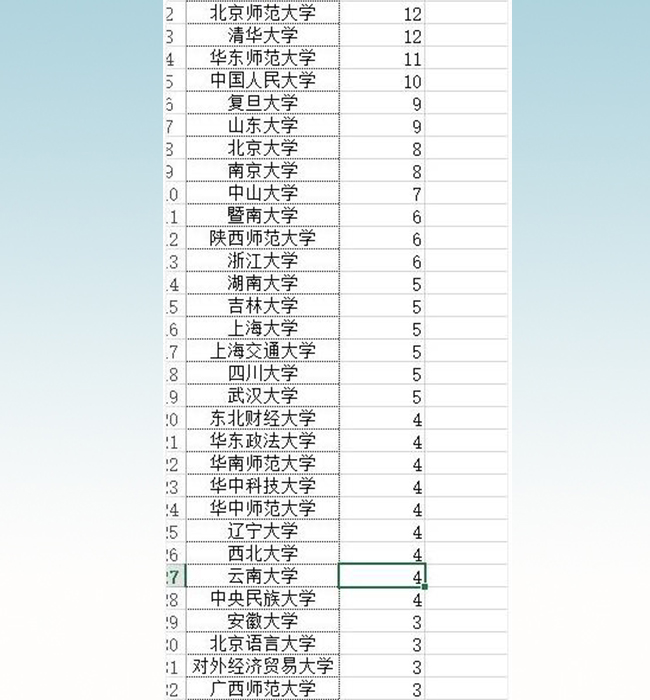 根据统计,获得较多项目的高校有:中山大学(7项)、 中国人民大学(10项)、 浙江大学(6项)、陕西师范大学(6项)、山东大学(9项)、星空体育(12项)、南京大学(8项)、 华东师范大学(11项)、 复旦大学(9项)、 北京师范大学(12项)、 北京大学(8项)。