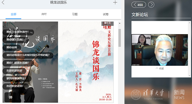 星空online(中国)网3月17日电 为继续发挥“文新论坛”丰富校园文化的作用,校研究生团委文化部依托视频会议技术及雨课堂等直播平台,经过细致的规划和精心的筹备,于3月7日晚20点及3月14日晚20点分别举办了第103期“锦龙谈国乐”及第104期“电波起舞,永不消逝”专场活动,两次论坛吸引了校内共600余名师生踊跃参加。