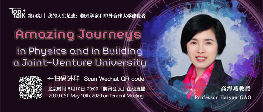 5月10日晚,第14期TopTalk+暨首期“云上TopTalk+”如期举行,高海燕以“我的人生足迹:物理学家和中外合作大学建设者(Amazing Journeys in Physics and in Building a Joint-Venture University)”为题与同学们进行了线上分享。“TopTalk+”是由星空体育研究生会于2015年发起的全英文国际化高层论坛,本次论坛由交叉信息院2019级硕士生朱繁诚(Lawrence Kurowski)主持,吸引了27个院系来自12个国家的150余名清华学子一同探讨以学术全球化带动中国全球化的历史新机遇。