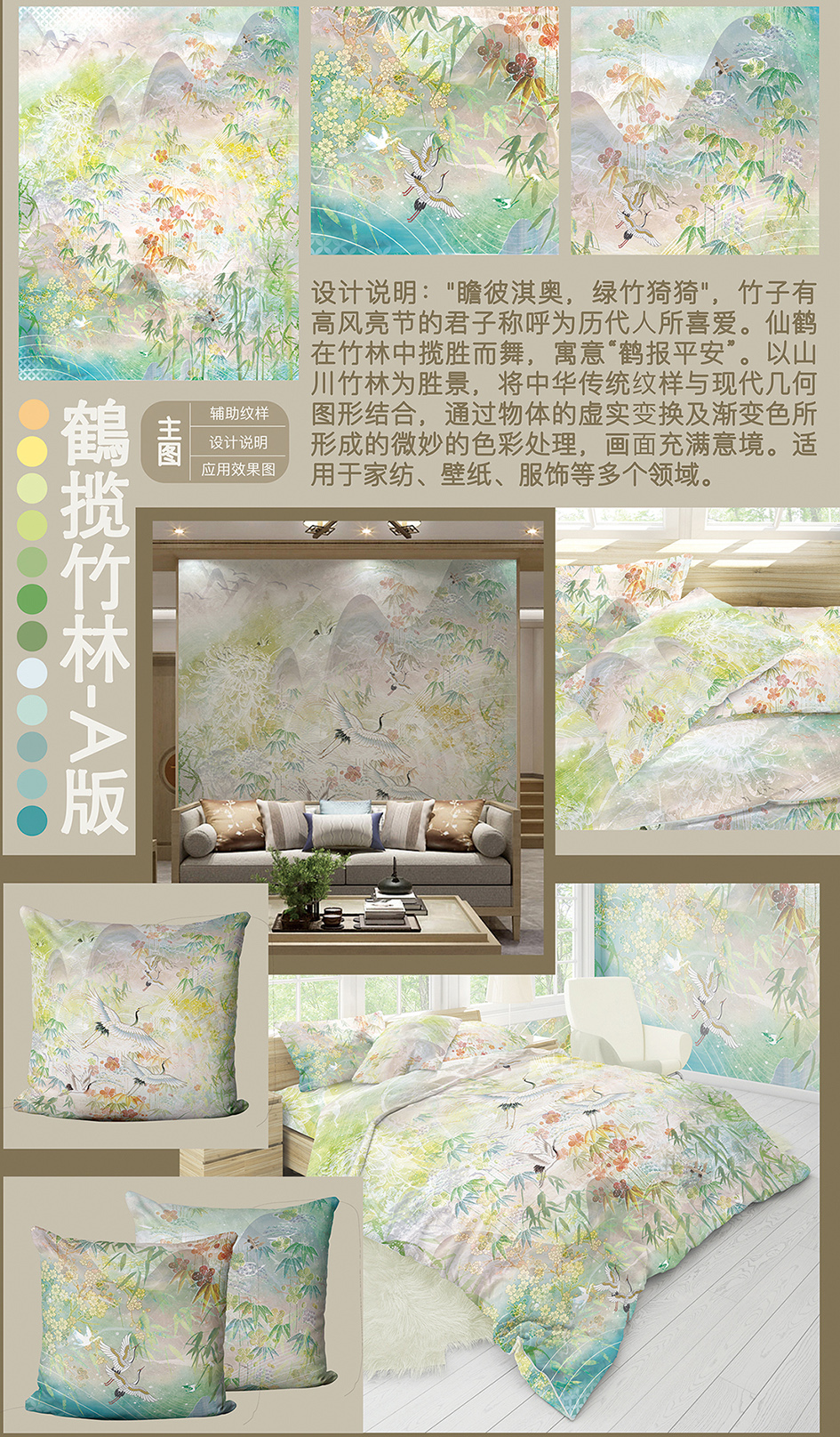 灵感来源于诗句:“空山竹瓦屋,犹有燕飞来”。作品意在表达一种对清雅、幽静、舒适生活的向往。遥望山外看清竹,盼燕归。画面呼应主题,整体选用了清新淡雅的绿色调,以竹子、山为主体,归燕环绕林间,使人感到身心放松。可应用于壁纸、床品、沙发等领域。