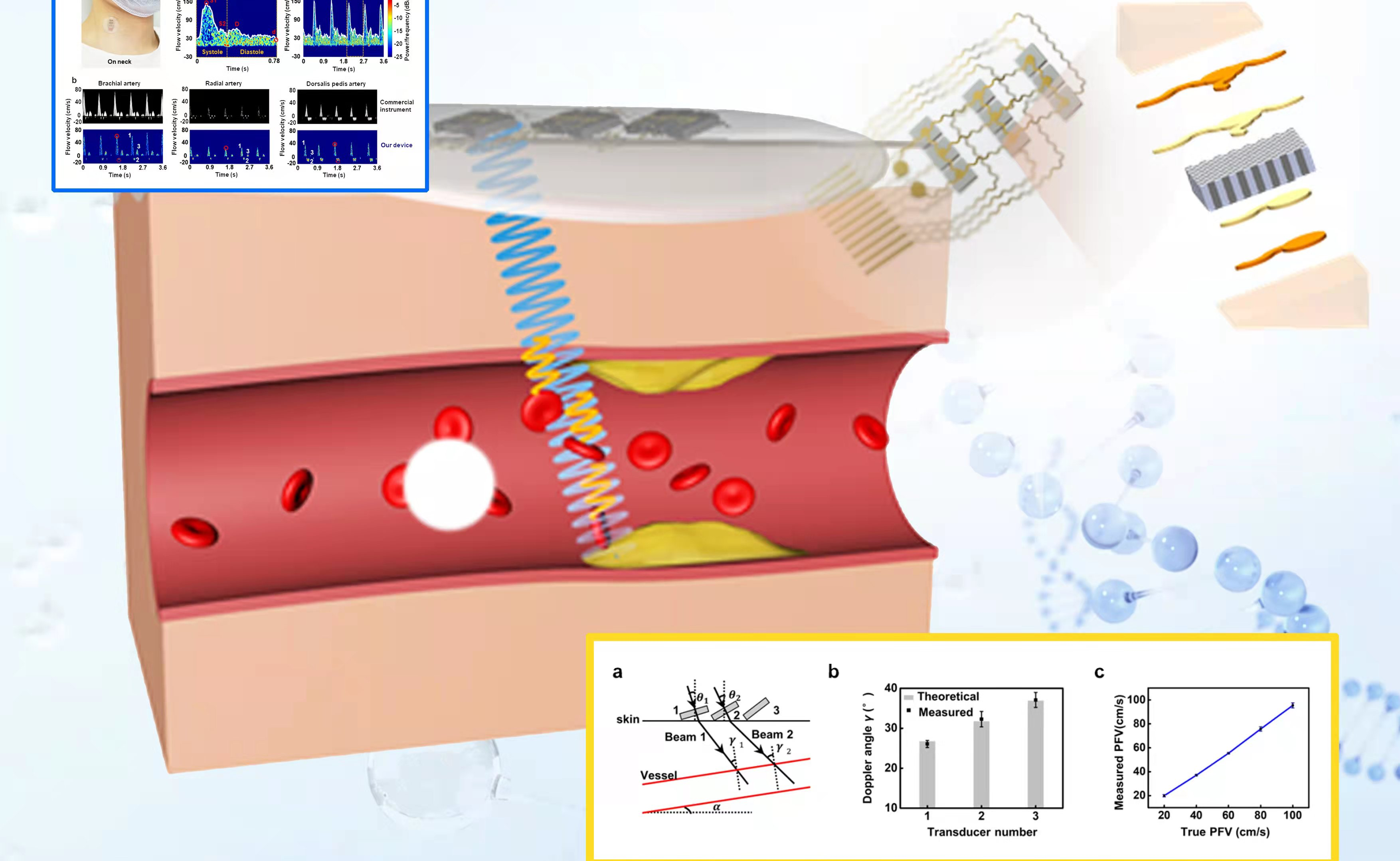 航天航空学院、柔性电子技术研究中心冯雪教授课题组与北京协和医院杨爱明教授团队合作报道了一种可实时连续监测血管血液流速的柔性多普勒超声电子器件。该器件厚度仅1mm,重0.75g,可轻柔贴附于皮肤表面,并达到和临床大型超声设备相近的测量精度。该柔性...