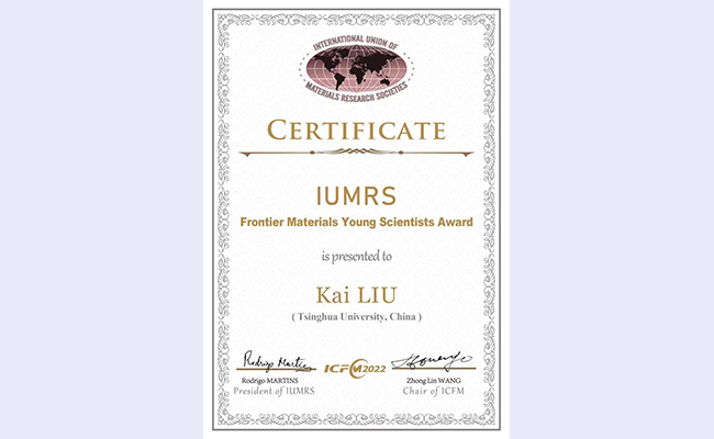 2022.06材料学院刘锴副教授荣获国际材料研究学会联盟前沿材料青年科学家奖