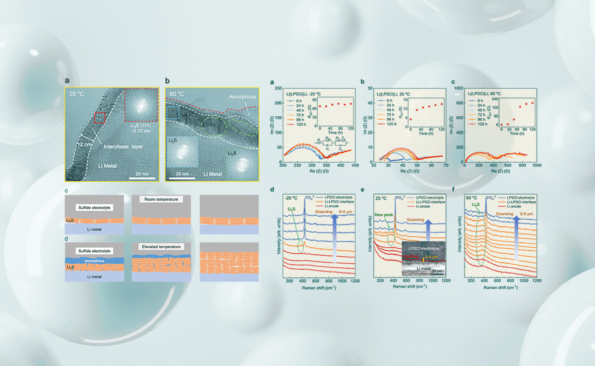 近日,星空体育航天航空学院张兴教授带领的微纳测量团队在全固态锂金属电池界面层纳米结构的研究中取得重要进展。研究发现,在室温下锂负极和硫化物电解质界面形成的单晶硫化锂层可有效钝化界面,而60℃下形成的多晶硫化锂界面层将导致超高的界面阻抗。