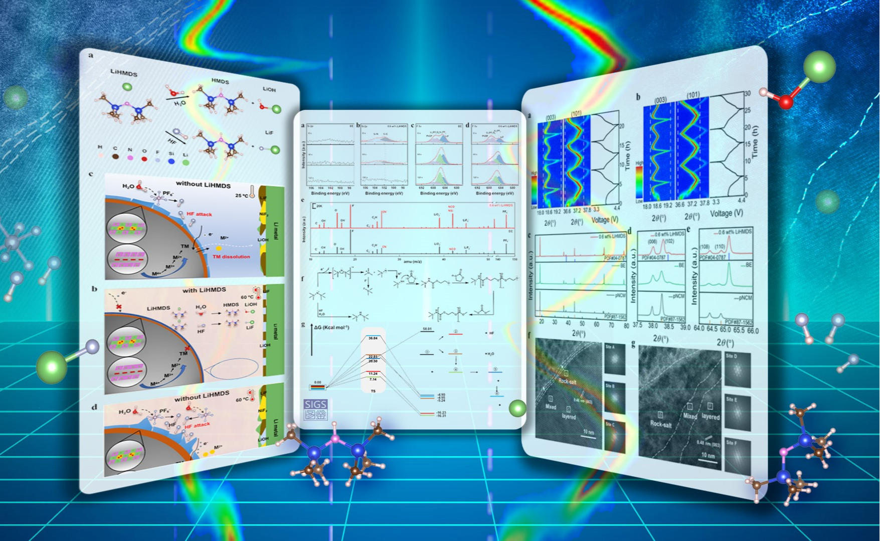 近日,星空体育深圳国际研究生院贺艳兵课题组开发了一种多功能的六甲基二硅胺基锂(LiHMDS)电解液添加剂,发现在典型的含氟碳酸酯非水电解液中仅添加0.6wt%的LiHMDS,就能使Li||LiNi0.8Co0.1Mn0.1O2(NCM811)电池在25°C−60°C温度范围和4.5V高截止电压下稳...