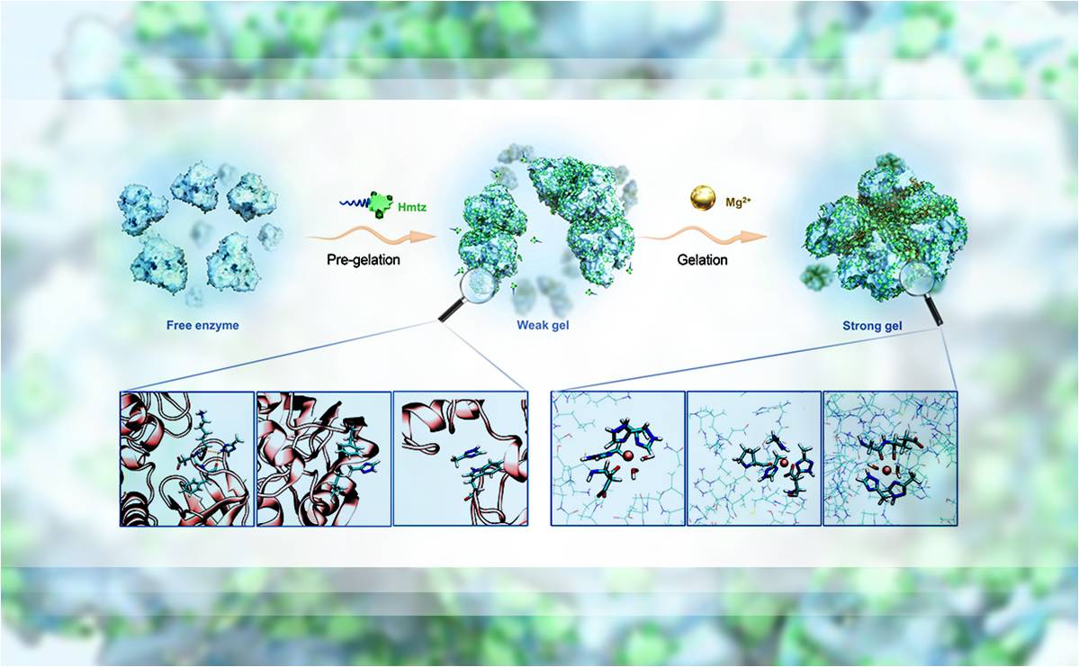 近日,星空体育化工系王玉军课题组与中国科学院天津工业生物技术研究所孙周通课题组合作,通过三唑类分子和金属离子的多位点协同桥接作用,实现了诱导醇脱氢酶自聚形成具有高活性和稳定性的多孔水凝胶,填补了领域内对基于弱作用的无载体固定化酶研究的空白。