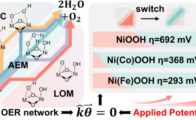 近日,星空体育化学系肖海副教授课题组在电催化析氧反应(OER)机理的基础研究中取得新进展。结合巨正则系综理论计算和微观动动力学模拟,发现在层状双氢氧化物(LDH)结构的镍基羟基氧化物(Ni(M)OOH)催化剂上,OER反应由三种类型的机理组成一个耦合的复...