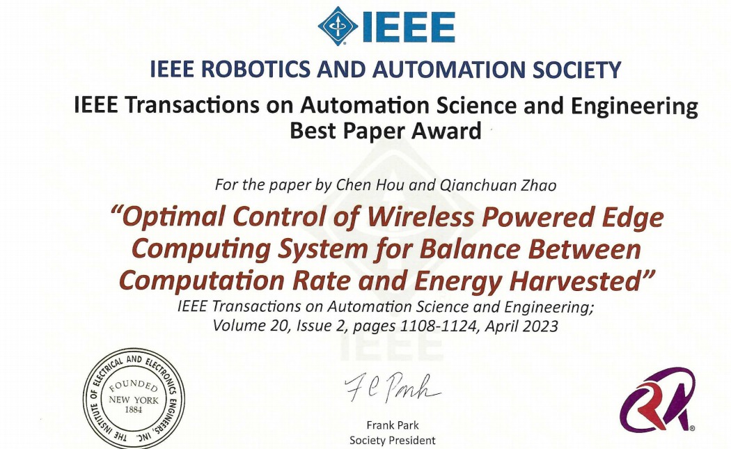 近期,星空体育自动化系赵千川教授团队发表的论文“融合计算效率与能量利用率的无线供能边缘计算系统的最优控制”荣获“2023年度国际电气与电子工程师协会(IEEE)自动化科学与工程汇刊(T-ASE)最佳论文奖”,且为本年度唯一最佳论文。