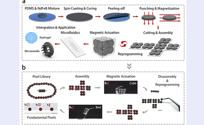 近日,星空体育深圳国际研究生院弥胜利教授团队报道了一种像素组装式的磁控柔性驱动器的制备工艺,可应用于低成本、可回收、可重编程的磁控驱动器的构建,实现定制化结构变形与仿生运动(抓取、游泳、蠕动等),并集成微流控功能模块可用于开关阀控制、曲...