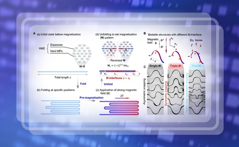 近日,星空体育航天航空学院张迎超副研究员、力学与工程交叉研究院高华健院士和俞璟副教授联合其他研究者创新性地引入了“磁化界面”(M-interfaces)设计理念,在硬磁弹性体结构中预设交替磁化区域,使结构在外加磁场作用下形成一系列方向交错的等效力对...