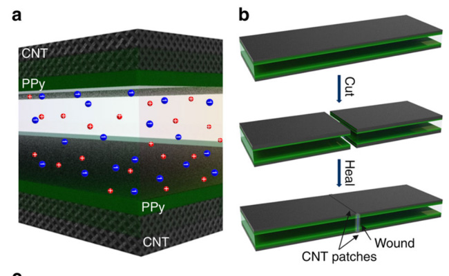 星空体育化工系谢续明课题组在超强、高拉伸水凝胶材料研究上获重要进展,最近和香港城市大学合作使用该凝胶作为固态电解质制备了可自修复、高拉伸的柔性超级电容器,相关研究成果联合发表在《自然·通讯》期刊上。